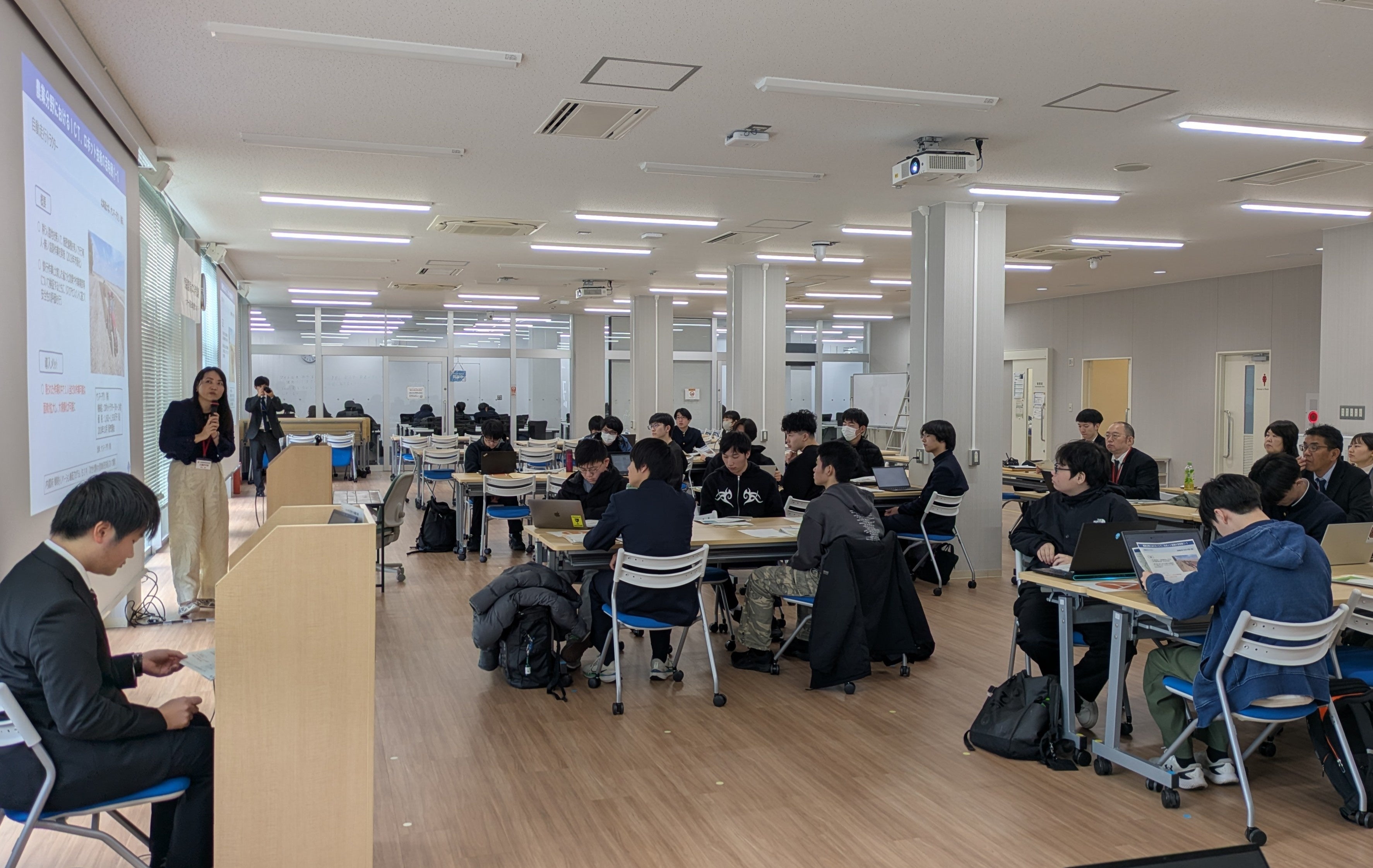 学生による事例発表では、情報機械システム工学科の学生がPBLで取り組むスマート農水産業の研究を紹介しました。松下室長からは、地域課題に即した技術開発の意義や、全国展開・製品化への期待が寄せられました。