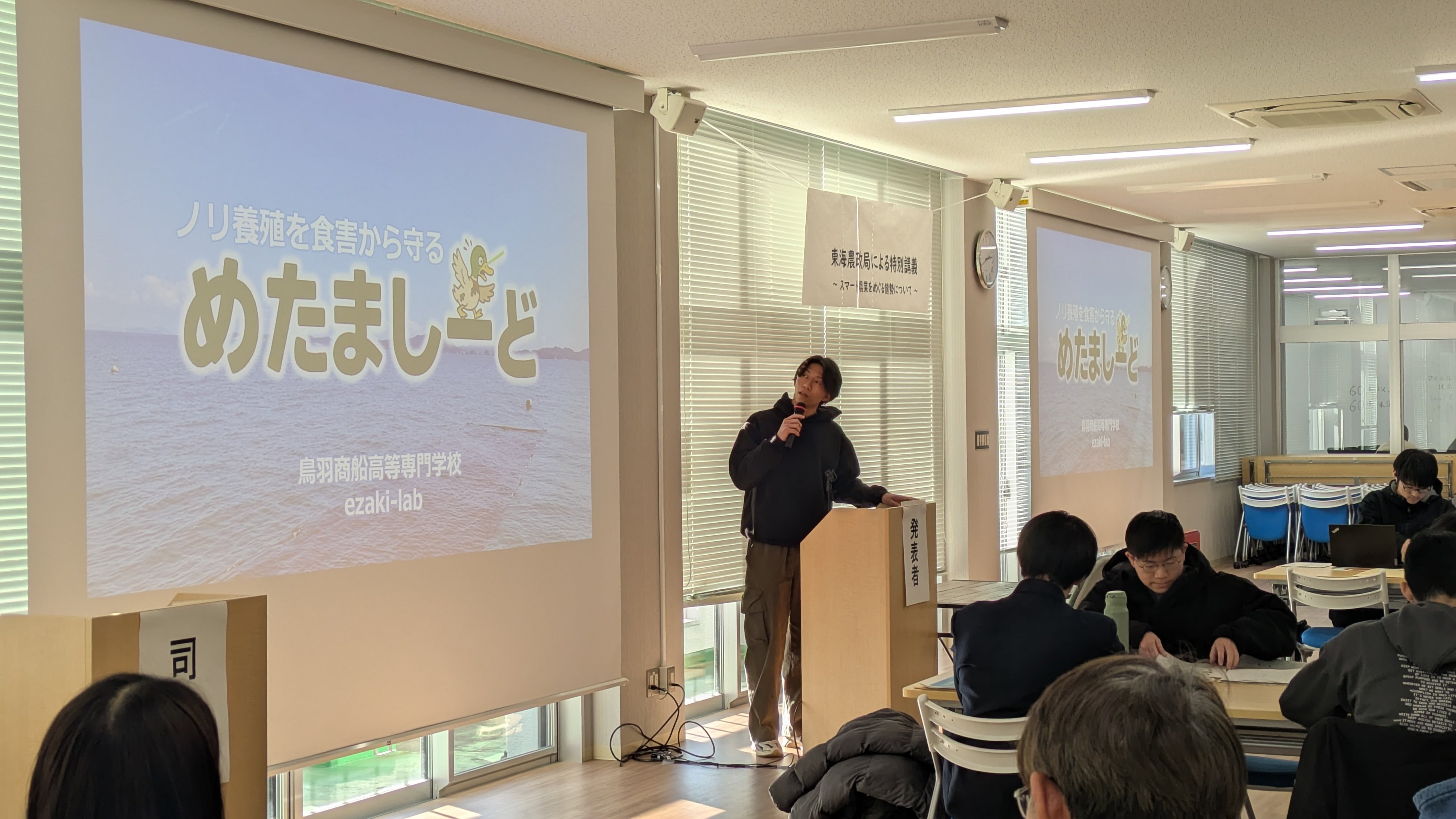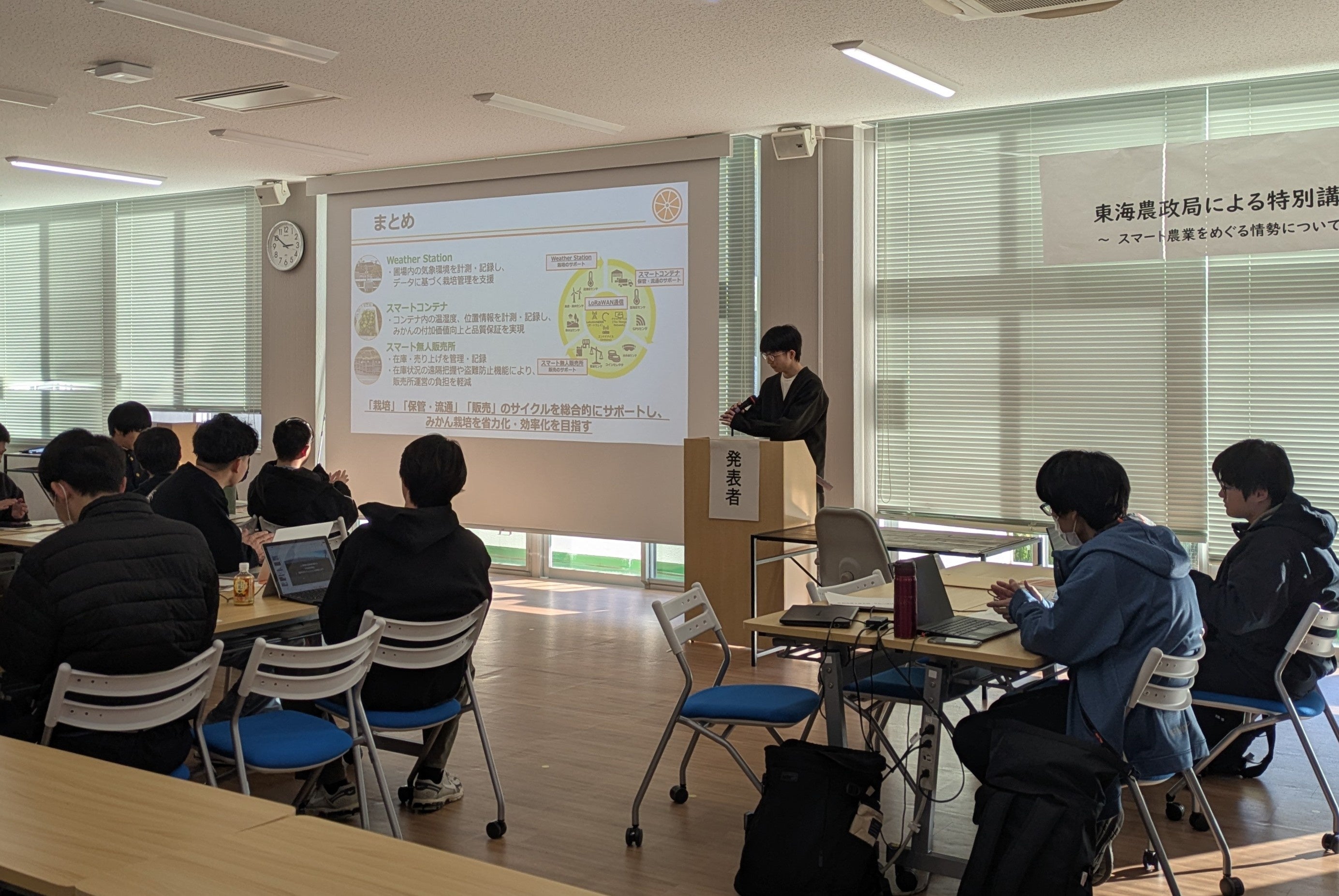 鳥羽商船高等専門学校(三重県鳥羽市、校長:古山雄一、以下「鳥羽商船高専」)は、令和8年1月9日(金)、東海農政局による特別講義、学生による事例発表およびグループワークを実施し、関係する同校情報機械システム工学科および専攻科生産システム工学専攻の学生と教職員が参加しました。