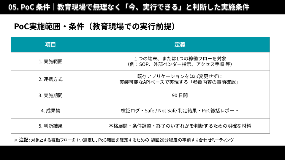 【 PoC実施条件の全体像(教育現場での実行を前提とした設計) 】1業務フロー・1端末から開始でき、既存システムや運用を大きく変更することなく、90日間で実運用に基づく検証結果を取得できるPoC設計。