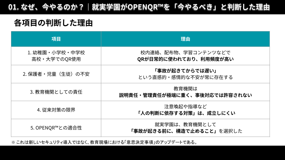 【 教育現場における「事後対応型」から「参照前確認型」への転換 】OPENQR(TM)は、事故が起きてから対応する従来型の対策ではなく、QRコードを開く前に安全性を確認することで、事故そのものを未然に防ぐ仕組みです。