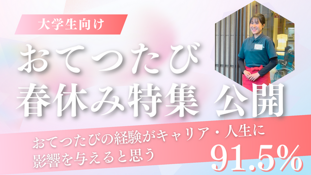 そこで、この長い春休みを「なりたい自分にアップデートする期間」に変えてほしいと考え、本特集を公開しました。 おてつたびを通じて、初めての場所に行き、初めて会う人たちとともに働く。この経験はきっと大きな自信につながったり、今後の就職活動や将来の視野を広げるきっかけになるはずです。
