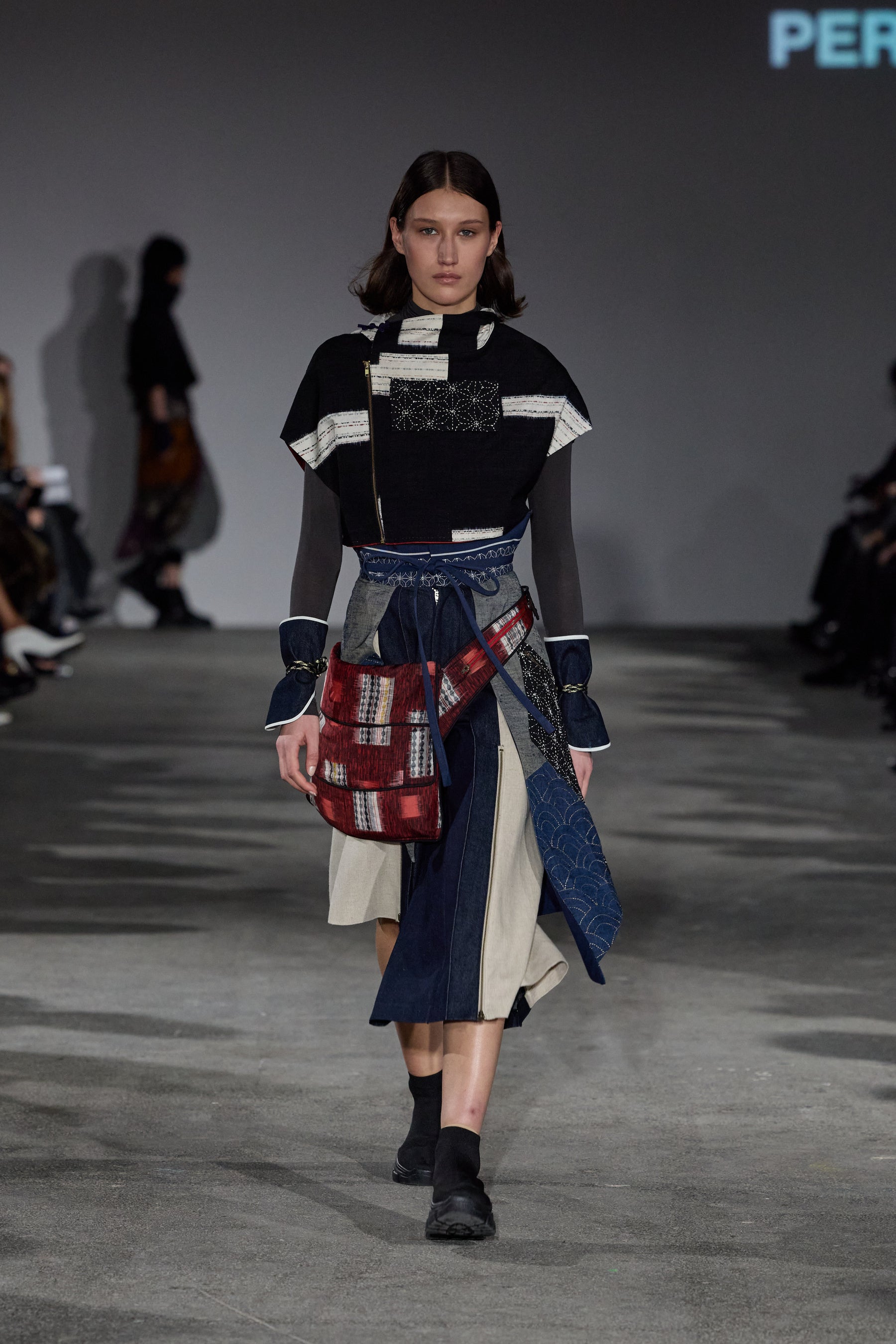 Q+FLOW (キューフロウ)は日本人デザイナーによる、国産の素材を使用し、日本の職人によって縫製されたMade in Japanのバッグ&アクセサリーブランド。常に自問自答し模索をし続け(Self-Questioning, Quest)、大きな社会の流れ(Flow)の中で成長していきたい。社会の中でブランドとしてどういう形で貢献でき、より良い循環ができるか常に挑戦したいというデザイナーの想いから生まれている。今回のショーではバッグの生産で使われなかった余りの革で衣装を制作した。