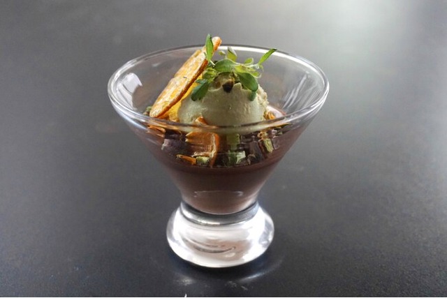 濃厚でなめらかなチョコレートのパンナコッタに、香ばしさとコクを感じるピスタチオアイスを合わせました。仕上げには国産みかんを丁寧に輪切りして乾燥させ、チョコレートのほろ苦さと甘みの余韻に、やさしい柑橘の香りを添えています。