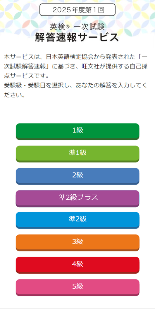 「英検一次試験 解答速報サービス」は、公益財団法人 日本英語検定協会から発表された「一次試験解答速報」に基づき、旺文社が提供する無料の自己採点サービスです。