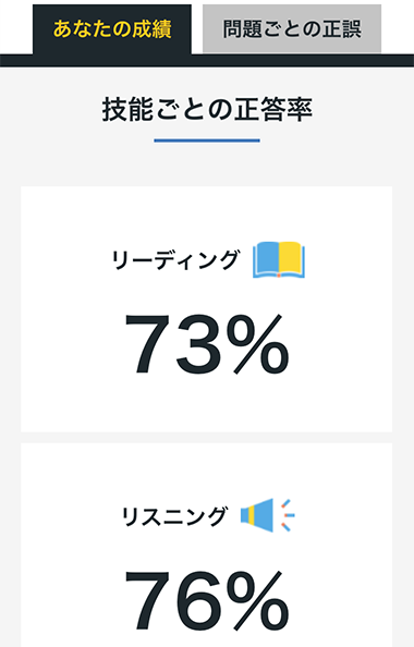 3. 技能ごとの正答率や問題ごとの正誤が瞬時に表示されます。