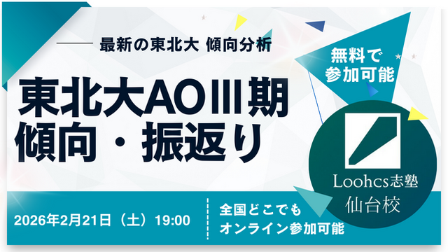 総合型選抜(AO入試)専門塾「Loohcs志塾 仙台校」は、新高校3年生を対象としたオンライン解説イベント「2026年度 東北大学AOIII期入試 振り返り解説イベント」を開催いたします。