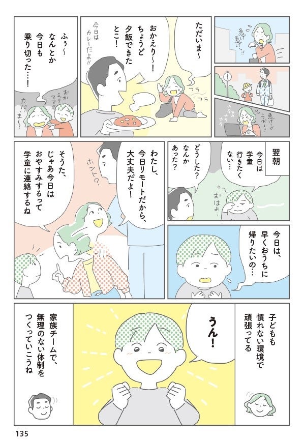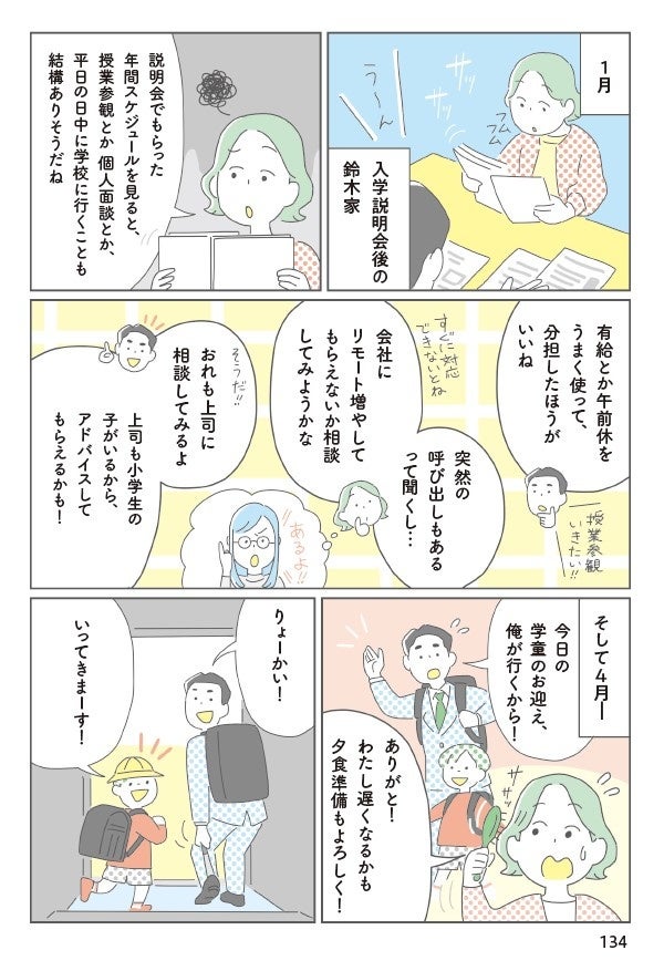 POINT 1:親子で準備しておきたいことが見える化できる小学校の入学準備から、小1の学校生活、学習や人間関係、親の働き方まで、「知っておきたいこと」や「やっておきたいこと」がひと通り分かり、親子で準備すべきことが見える化できます。小1の壁に直面する家族のストーリーを、各章の導入としてマンガにしているので、困りごとや対策などもイメージしやすいのが特長です。