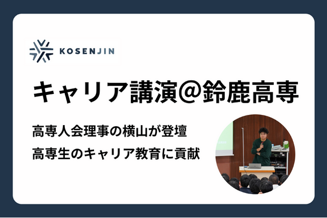 高専OBOGらにより発足した一般財団法人高専人会(東京都品川区・代表理事 渋谷修太)は、2025年12月3日(水)に鈴鹿工業高等専門学校にて在学中の2年生に対するキャリア講演を実施いたしました。当日は、高専人会理事で株式会社プロッセルホールディングス 代表取締役CEOの横山和輝が登壇しました。自身の高専時代の経験や、起業家としてのリアルなキャリアストーリーを赤裸々に語り、進路に悩む高専生に「こんな生き方があるんだ」と多様なキャリアの選択肢を提示しました。今後も高専人会では、高専生のキャリア教育に貢献してまいります。
