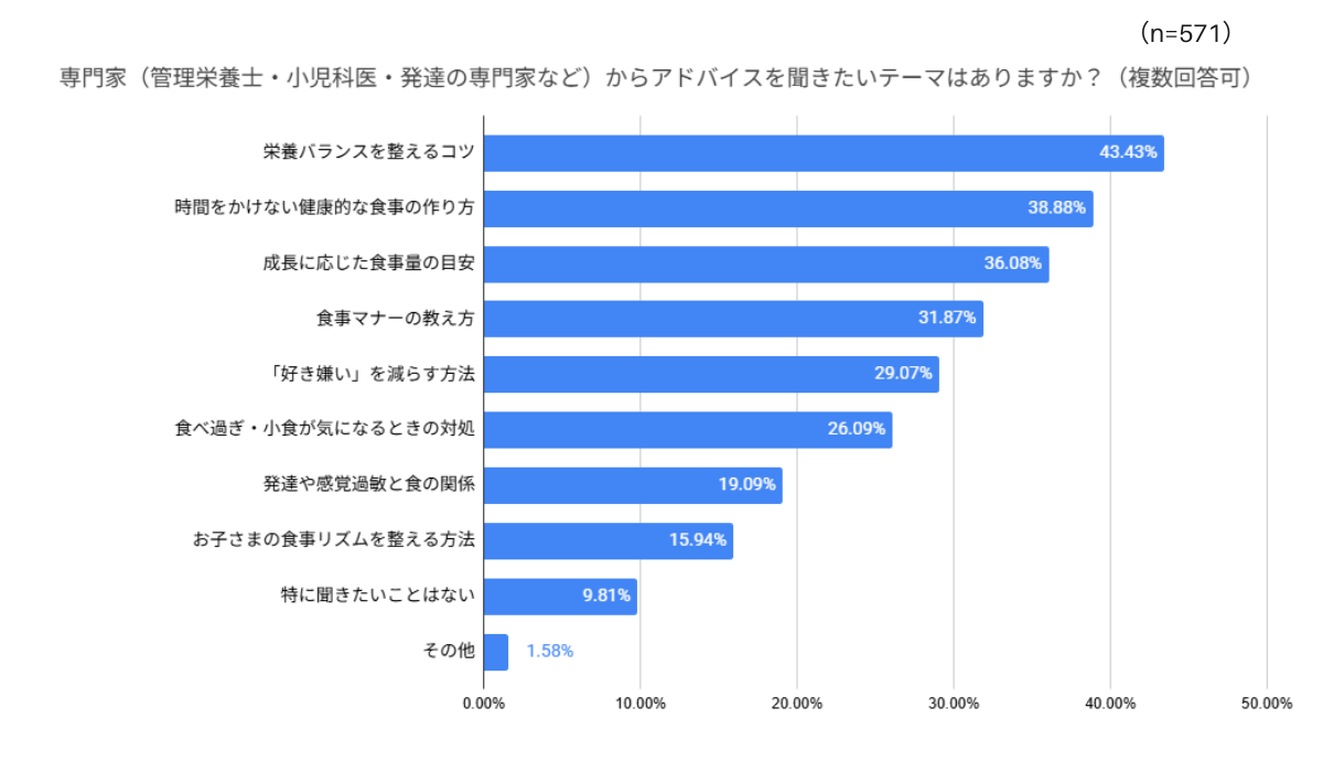 一方で、忙しい毎日の中でいかに時間を作るかも大きな課題となっているようです。専門家への相談テーマでは「時間をかけない健康的な食事の作り方」(38.88%)が2位に、そして記事で読みたいテーマの第1位は、60%近くが選んだ「時間をかけずに作れるレシピ」(58.32%)でした。「栄養バランス」の整った食事を、忙しい日々の中で「時間をかけずに」作る具体的な解決策を、非常に多くの保護者が求めていることが見て取れました。