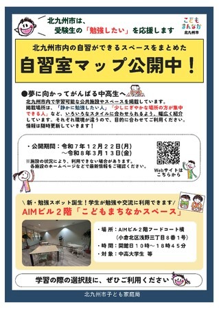 この「中高生向け 自習室マップ」は、令和7年度「みらい政策委員会」において、戸畑高校生徒会から寄せられた「勉強できる場所を分かりやすくまとめてほしい」という提言をきっかけに作成しました。掲載情報は随時更新しており、この取組は多くの協力施設の皆さまのご協力のもと進めています。北九州市はこれからも、市全体で「こどもまんなかcity」の実現に向け、こどもたちの声にも耳を傾けながら、一人ひとりの挑戦を応援する取組を進めていきます。