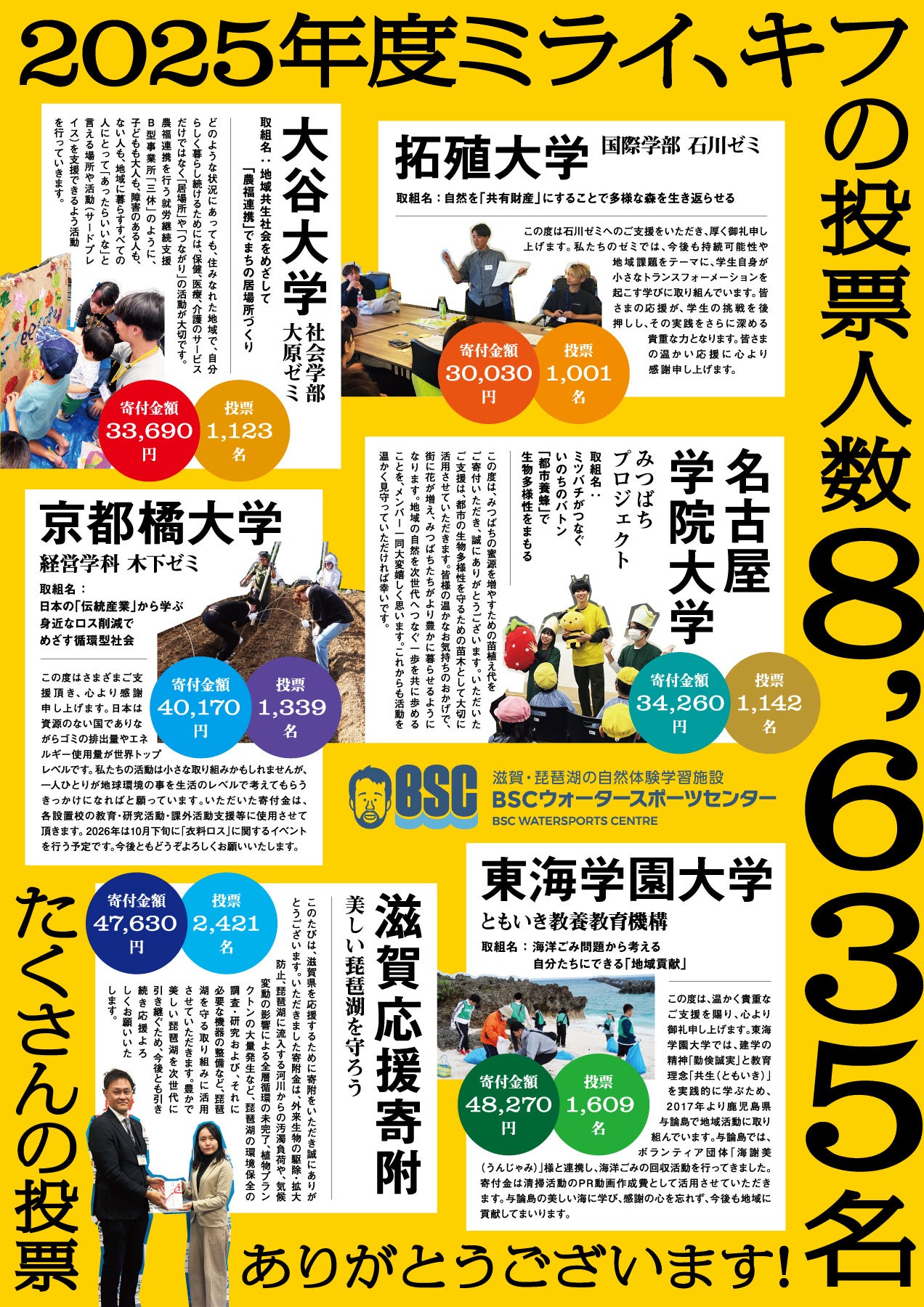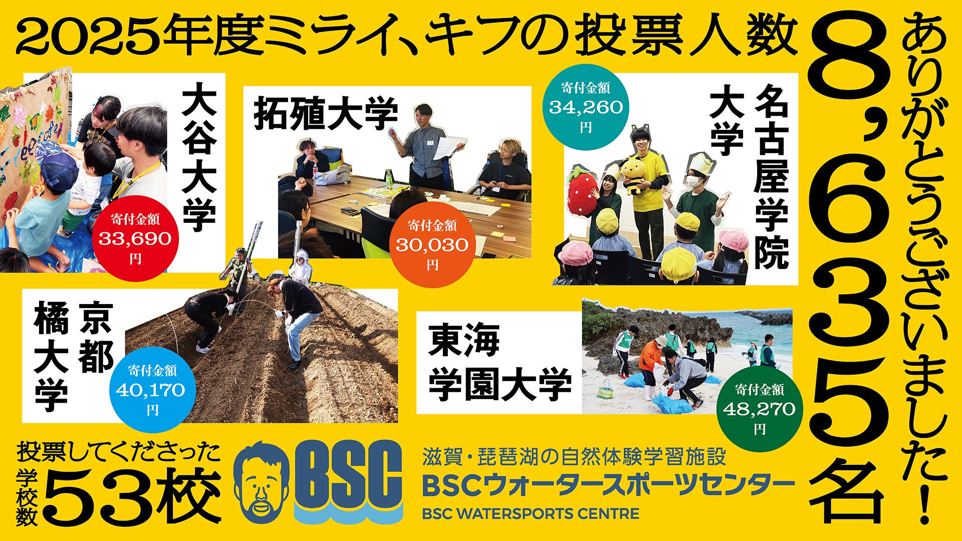 滋賀・琵琶湖の自然体験学習施設BSCウォータースポーツセンター(所在地:滋賀県大津市、代表取締役:井上良夫、以下 BSC)は、2025年度に実施した社会貢献プロジェクト「ミライ、キフ」における投票結果が確定したことをお知らせします。