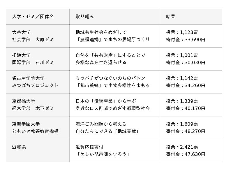 その1票が寄付金に変わり、大学生の活動資金として還元される仕組みです。