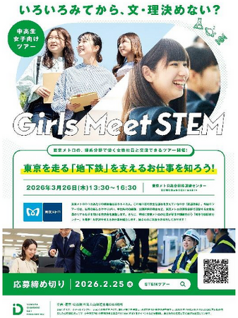 東京地下鉄株式会社(本社:東京都台東区、代表取締役社長:小坂 彰洋、以下「東京メトロ」)は、公益財団法人山田進太郎D&I財団(所在地:東京都港区、代表理事:山田 進太郎)が展開する中高生女子向けSTEM※1(理系)領域のツアー型体験プログラム「Girls Meet STEM」に参画します。