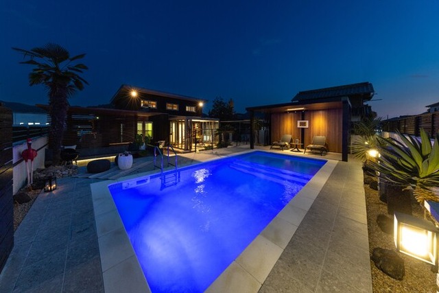 西脇市の展示場は、ペット連れでの見学を歓迎しています。施工後の生活をリアルにイメージできるよう、プール、アネックス(離れ)、ガーデンファニチャーまで含めたトータルコーディネートを展示。夜間のライトアップによる幻想的な演出も必見です。