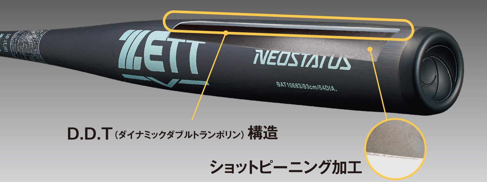 - 「振り抜きやすくバットコントロールしやすい!」打撃部の内側に無数の球状粒子を衝突させるショットピーニング加工により強度を上げることで本体の肉厚を薄く設計できる為、軽量化が可能となり、重量は700g中盤で展開。また先端細形状により振り抜きやすく操作性も高い。- 「広い打芯で柔らかく弾く!」本体先端部とテーパー部の肉厚を薄く設計するD.D.T(ダイナミックダブルトランポリン)構造により複合的トランポリン効果を発揮。ショットピーニング加工による薄肉設計との相乗効果により柔らかい打球感が得られボールを乗せて運べる!また、本体ストレート形状を長く設計することで打芯も広い!