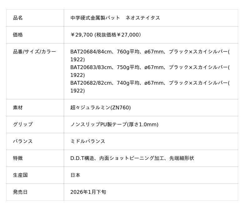 「ベースボールを科学する。」ゼット株式会社は、中学硬式野球に挑戦するプレーヤー向けに振り抜きやすく広い打芯で柔らかく弾く中学硬式金属製バット【ネオステイタス】を発売しました。