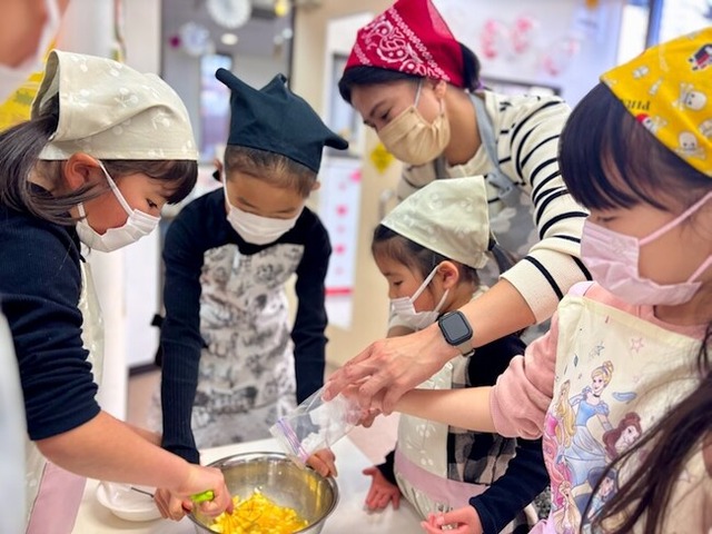 外国人講師とともに英語で楽しく調理し、味わう体験を通して、食への興味・関心を広げるとともに、異文化への理解と多様性を尊重する心を育みます。「英語で学ぶクッキング」という非日常の体験が、子どもたちにとって忘れられない豊かな思い出につながります。