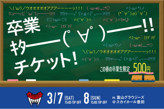 この度、今春ご卒業を迎えられる皆さまを対象に、シーホース三河からのお祝いの気持ちを込めた特別企画「卒業キタ━━(゜∀゜)━━!!チケット!」の販売が決定いたしました!