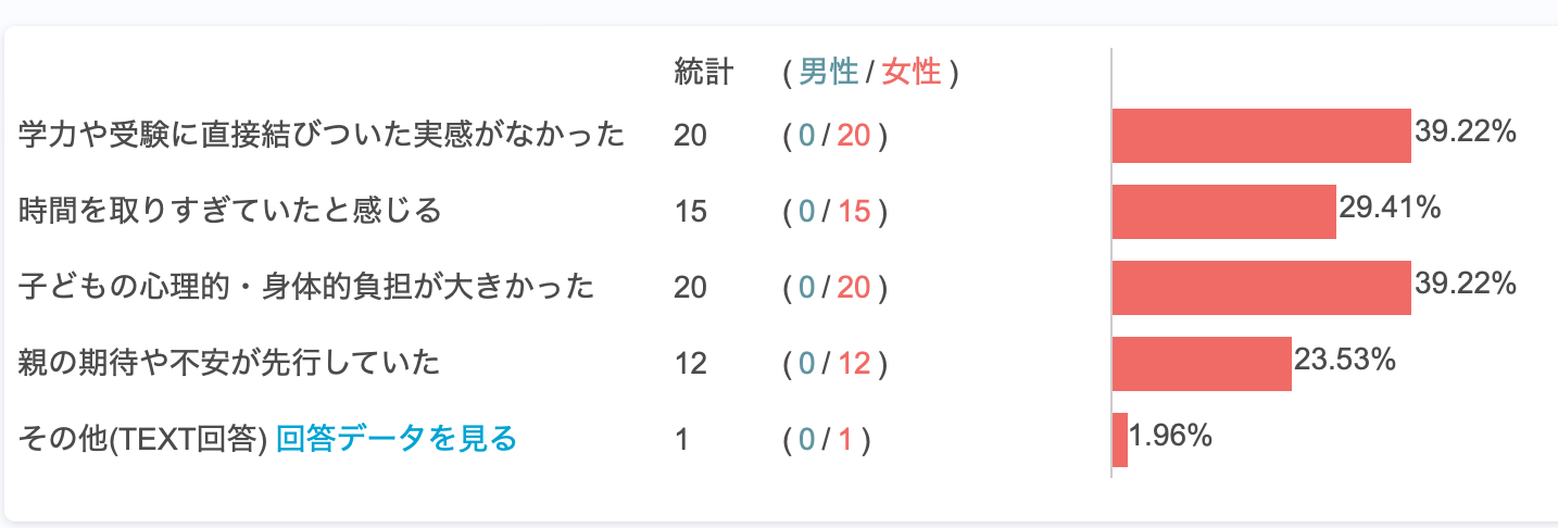 これらの結果から、後悔の背景には「成果が見えにくかったこと」だけでなく、子どもの心理的・身体的負担感が大きく関係していることがうかがえます。