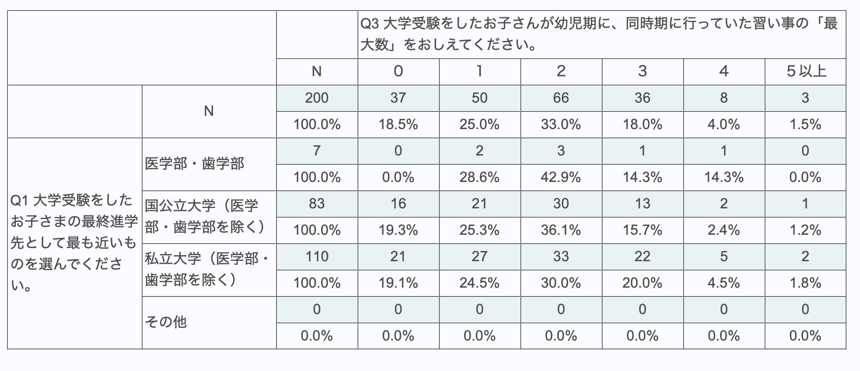 大学受験をしたお子さんが幼児期に、同時期に行っていた習い事の「最大数」