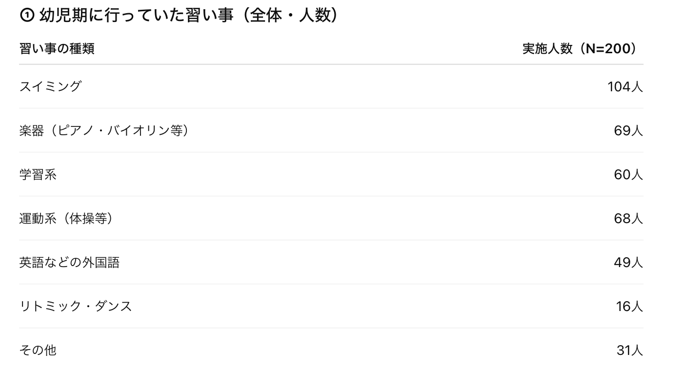 一方、スイミングは実施人数が最多であるにもかかわらず、後悔の声は相対的に少なく、幼児期の習い事としての納得度の高さがうかがえます。