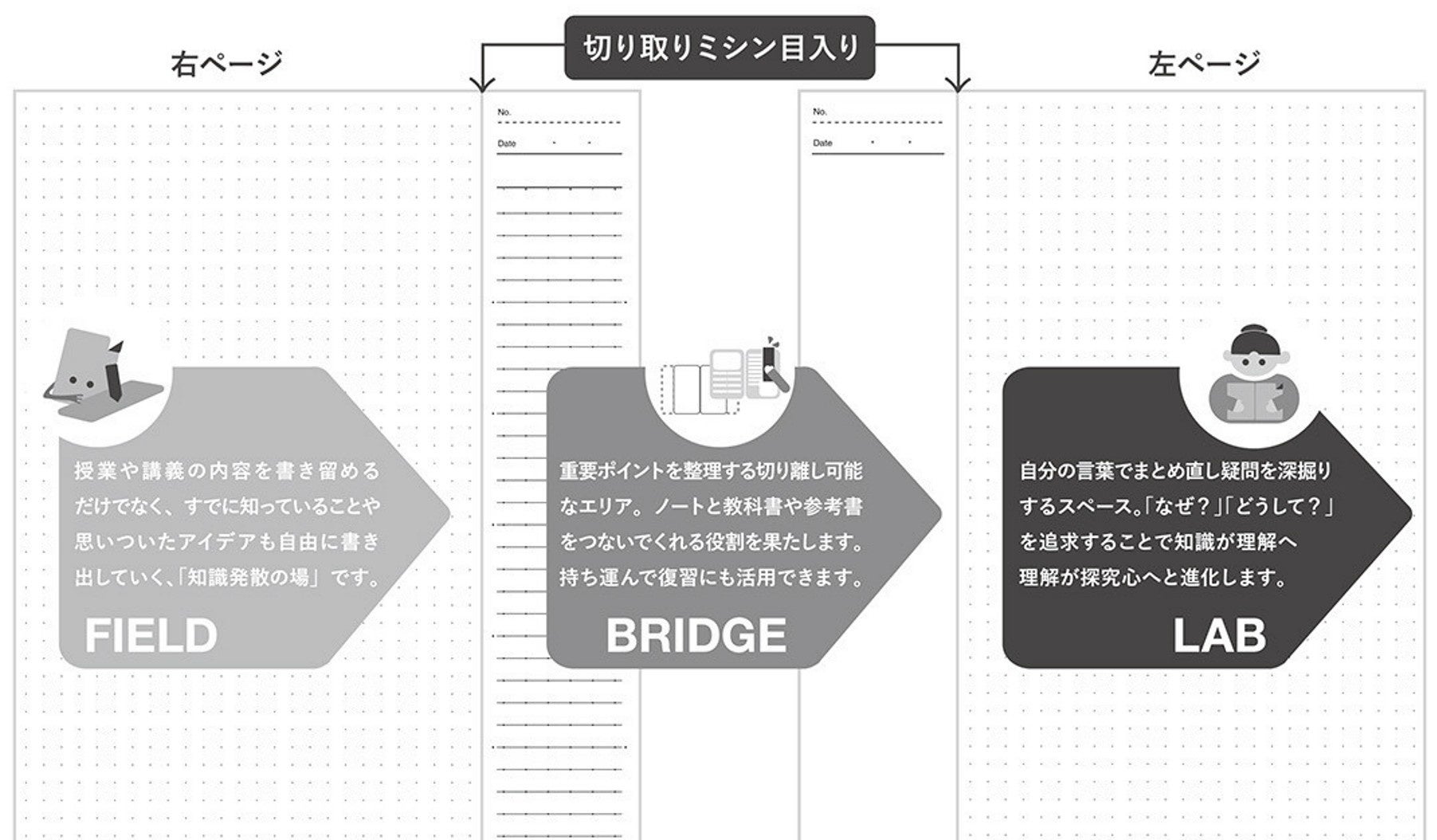 探究学習のサイクルである「発散、収束、思い出し」をサポートする中紙設計となっています。ノートの小口側にはミシン目で切り取れる「しおり」機能付きの縦長のスペースを設けています。切り取ったしおりを教科書に挟むことで、重要な内容をストーリーとして整理する手助けをします。