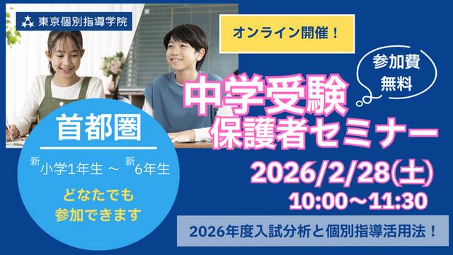 東京個別指導学院は、小学生から高校生を対象とする個別指導塾(ブランド名:東京個別指導学院、関西個別指導学院)をすべて直営にて展開する個別指導塾のパイオニアです。在籍生徒数は約3万1千名(2024年度期中平均)。講師は教科知識だけでなくコーチングスキルも磨いており、お子さまは実際の授業を受けたうえで学習目的や相性に合った希望の講師を選ぶことができるのが特長です。2025年度からは新たに「進研ゼミ個別指導教室」の運営もスタートしました。東京個別指導学院では中学受験をお考えの保護者に向けたオンラインセミナーを2025年より開始し、毎回ご好評をいただいております。今回は首都圏の新小学1年生~新6年生までの保護者を対象に「2026年度首都圏 中学入試の結果と2027年度の予測」、「注目校の入試問題分析報告」、「子どものやる気を引き出す親のかかわり方」、「学校選びの着眼点」といった内容を中学受験の専門家がくわしく解説します。