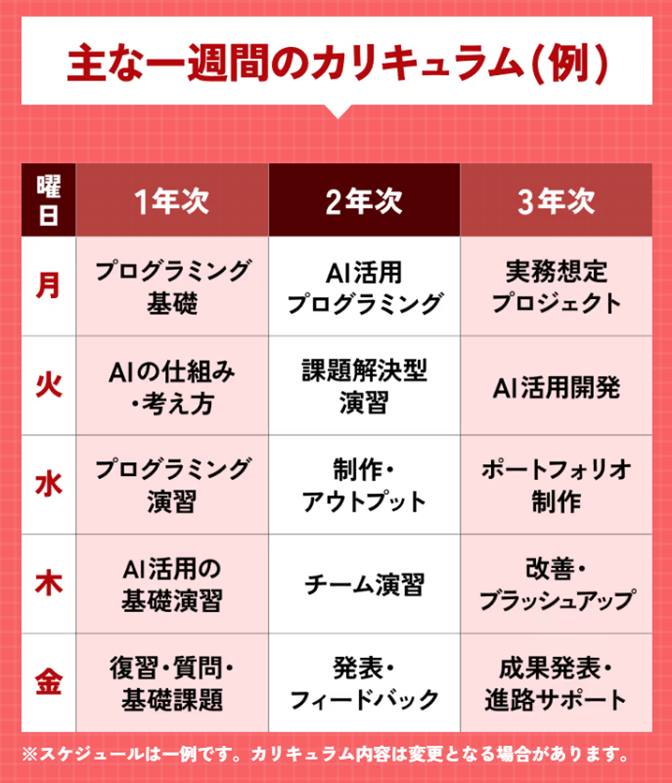 AIプログラミングカレッジは、プログラミングの基礎を確かな土台とし、AIを活用しながら設計・実装を行う力を養う3年制・全日制のプログラミングスクールです。