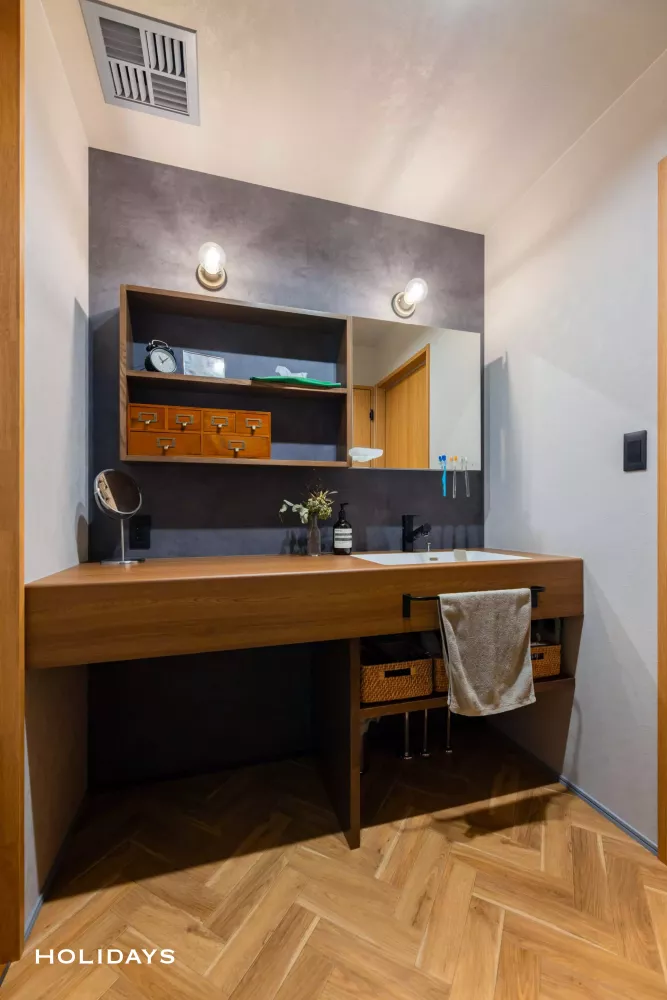 ディスプレイ感覚で使えるオープン収納に加え、ミラー内部にも収納スペースを設けることで使い勝手も抜群。背面はダークグレーの壁でアクセントを加えて意匠性の高い空間に。