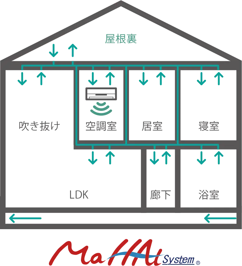 全館空調とは、家の中の空気を循環させ、家中の温度を一定に保つ冷暖システムのことです。