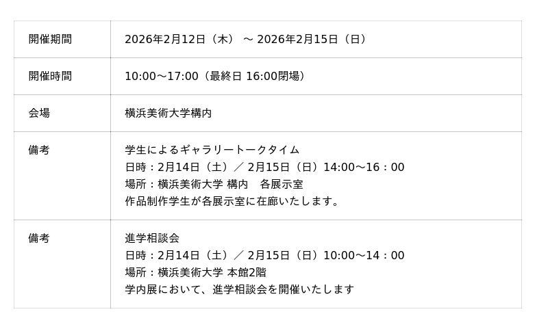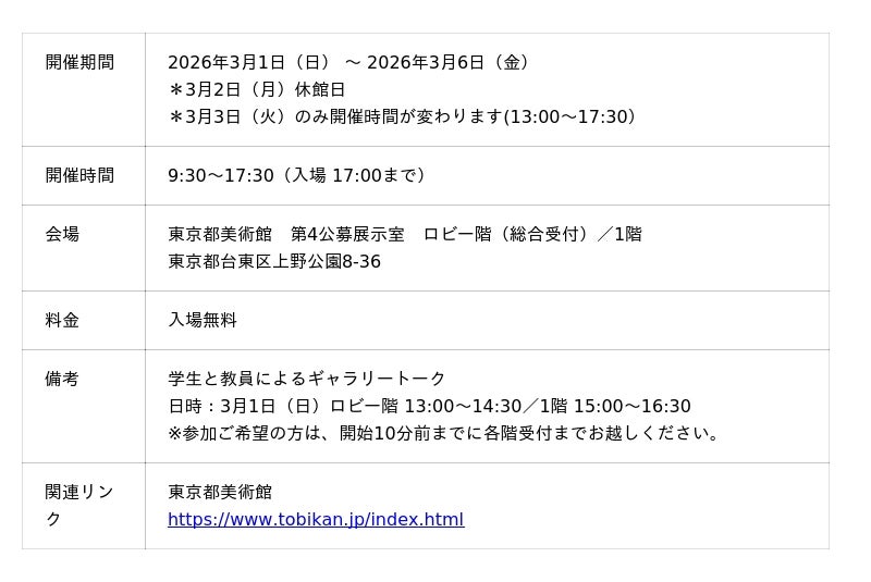 ・SNS 等で展示作品や制作学生に関する写真・情報を掲載される場合は、必ず制作学生本人の許可を得て いただきますようお願いいたします。