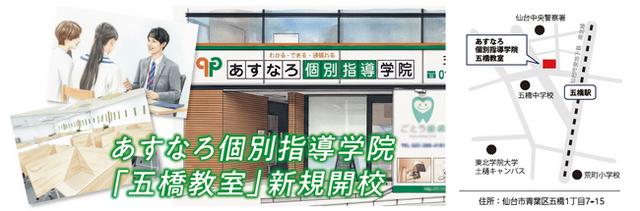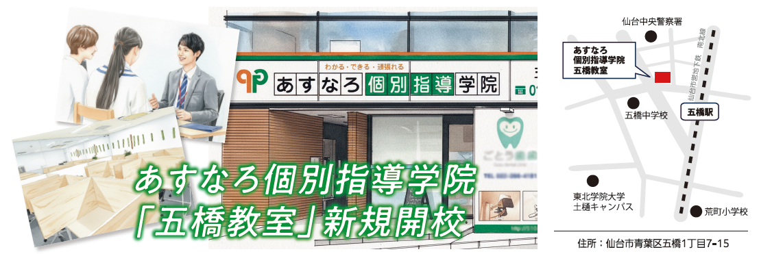 株式会社 学研ホールディングス(東京・品川/代表取締役社長:宮原博昭)のグループ会社、株式会社 学研スタディエ(埼玉・さいたま市/代表取締役社長:亀谷眞宏)が展開する、宮城県の総合進学塾 あすなろ学院は、令和8年2月15日(日)にあすなろ個別指導学院「五橋教室」を新規開校いたします。