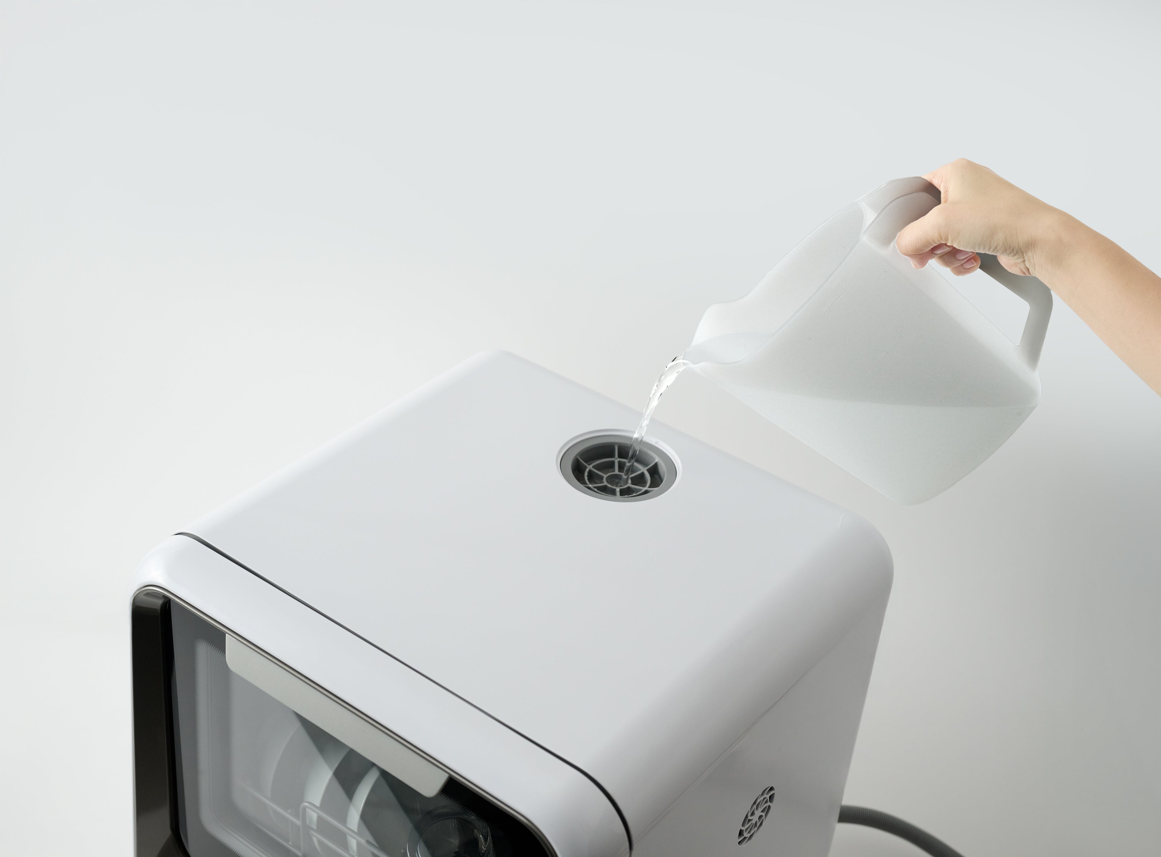 付属の給水カップで、本体上部から水を注ぐ「タンク式」を採用。水道工事不要で、購入したその日からすぐに使い始めることができます。