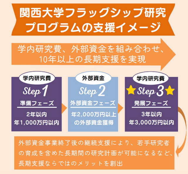 「関西大学が、少子化による受験生の減少という逆風の中でも、発展し続ける大学であるためには、研究力の強化が不可欠です。外部資金を獲得しても、事業期間終了後の継続資金が獲得できずプロジェクトが失速してしまうケースが多々あるが、外部資金事業の終了後も長期的かつ大規模な支援を行うことが本制度の特徴で、若手研究者の育成を含めた長期間の研究計画が可能になるなどのメリットにより、これまでにない研究プロジェクトの広がりが期待されます。トップクラスの実績を有する研究プロジェクトを重点的に支援することで、関西大学の研究力のさらに高めてまいります。」