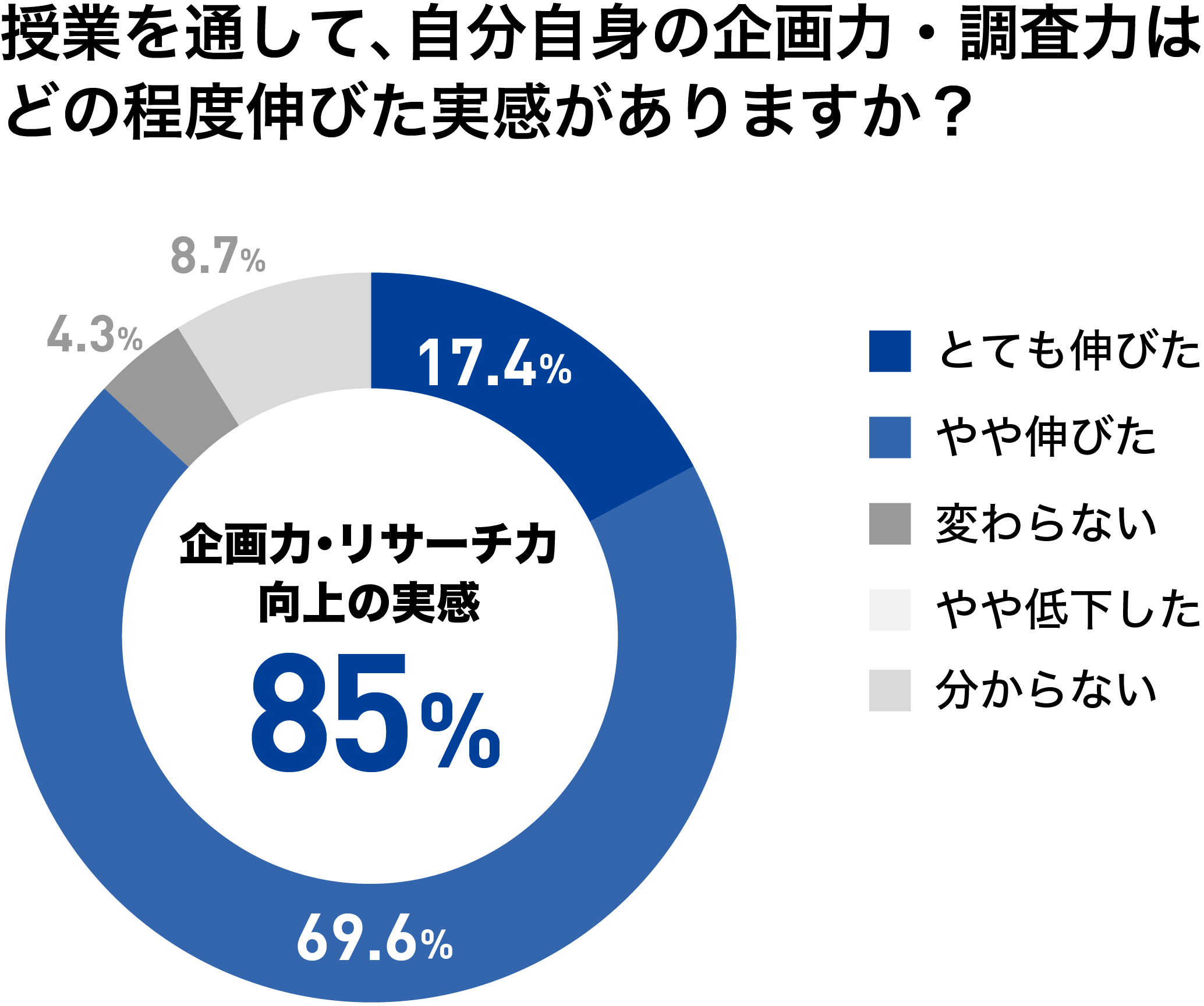 学生が自ら立案したビジネス企画を生活者の声をもとに検証・改善する実践型プログラムを通じ、授業満足度95%、成長実感85%という高い教育効果を確認しています。