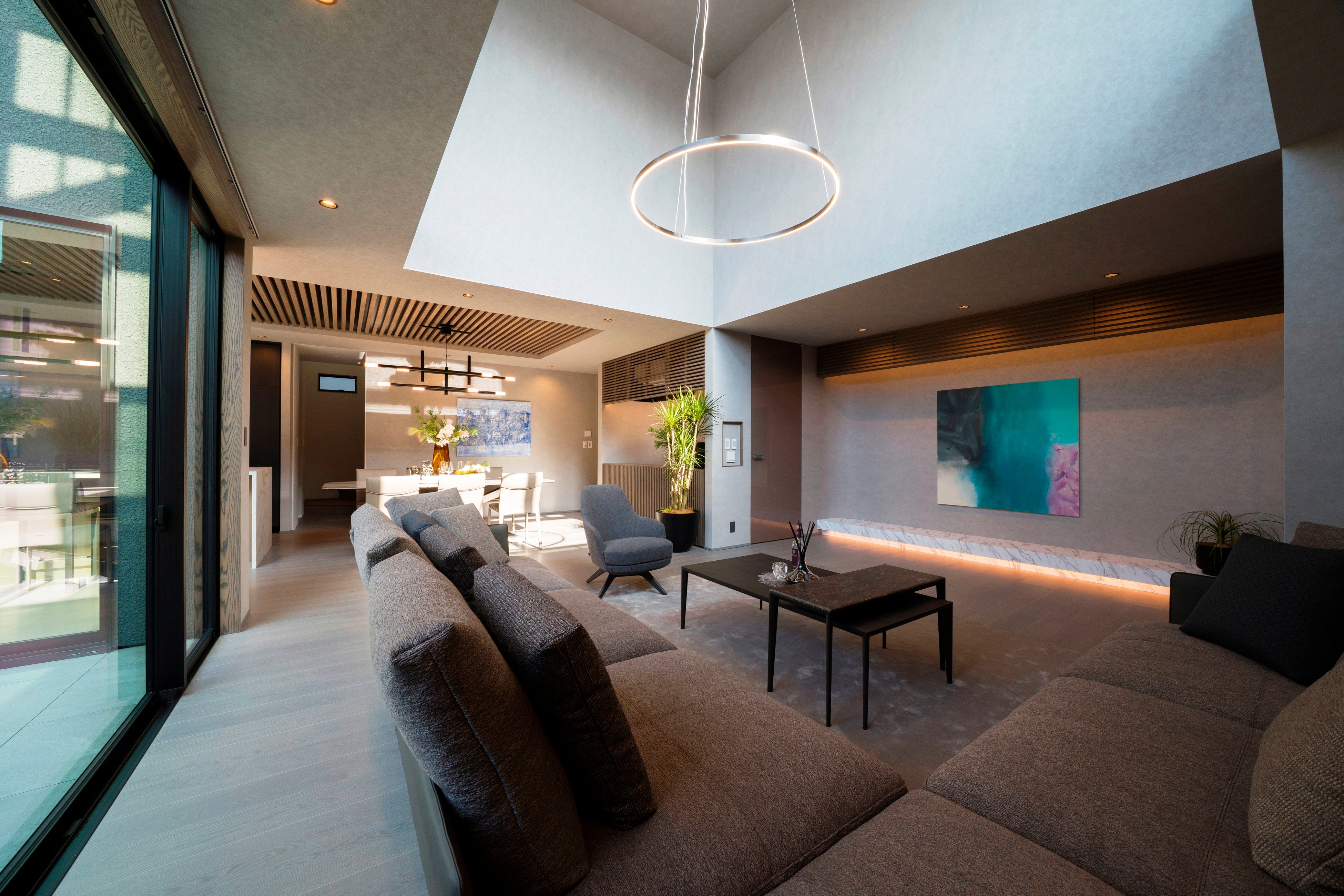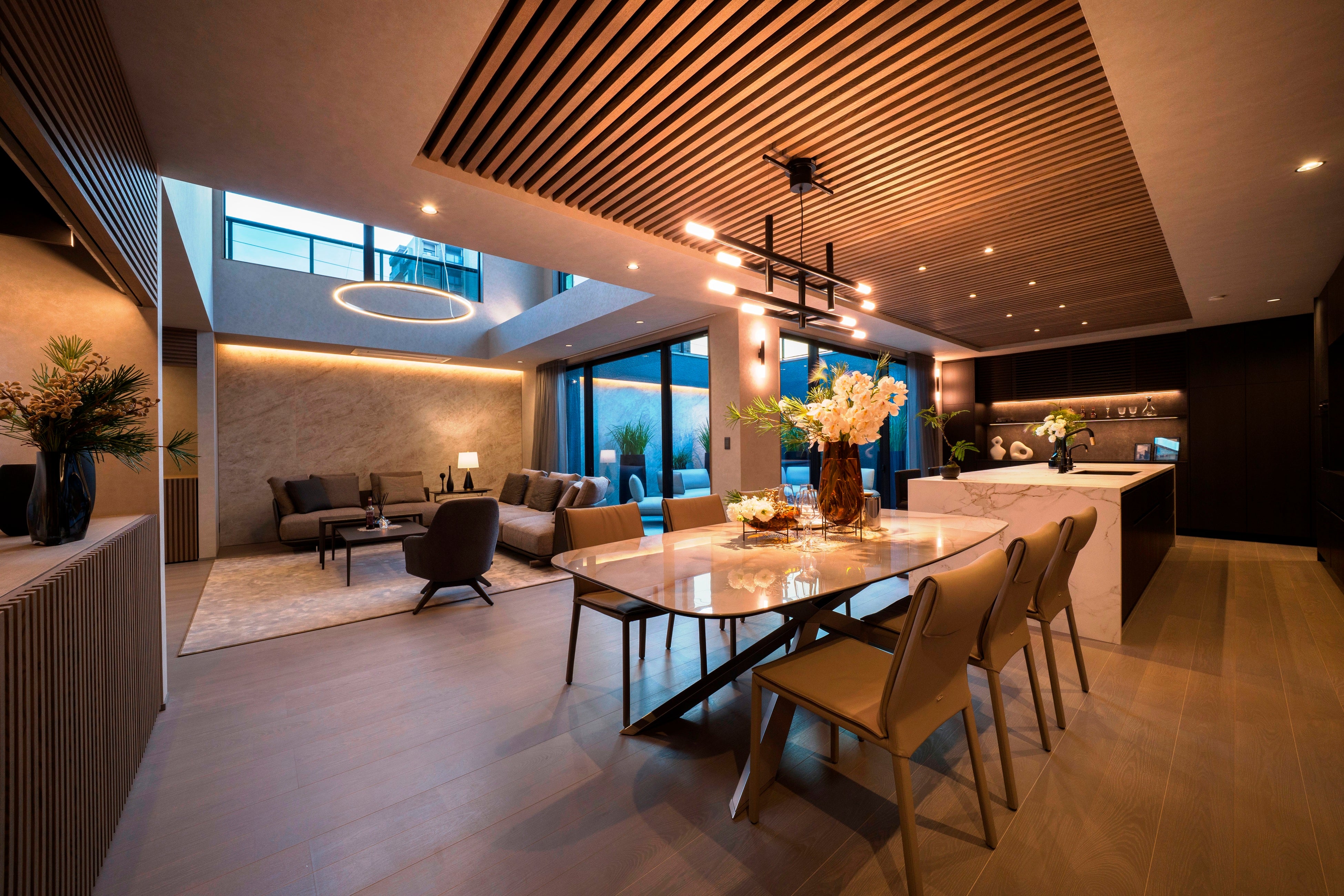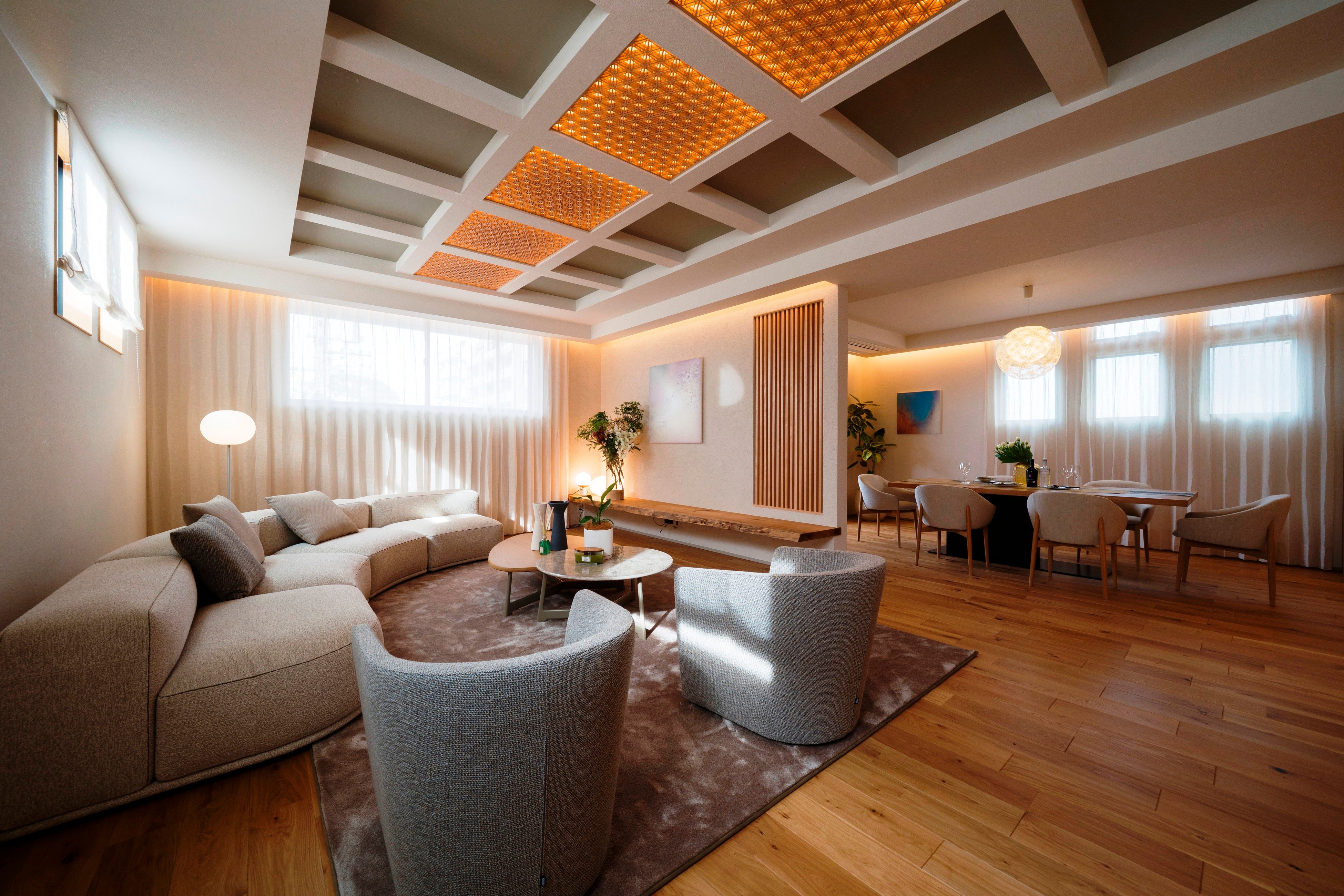 組子細工の天井が映えるAUTHENTIC LUXURYのリビングダイニング