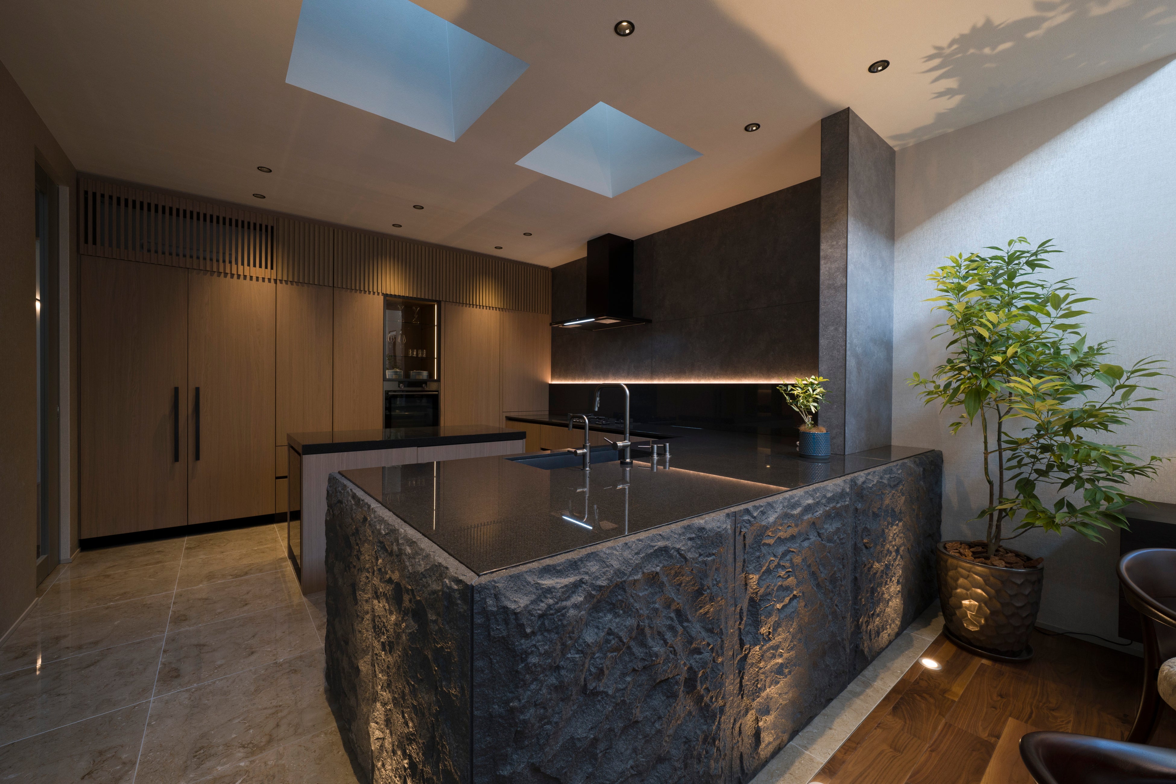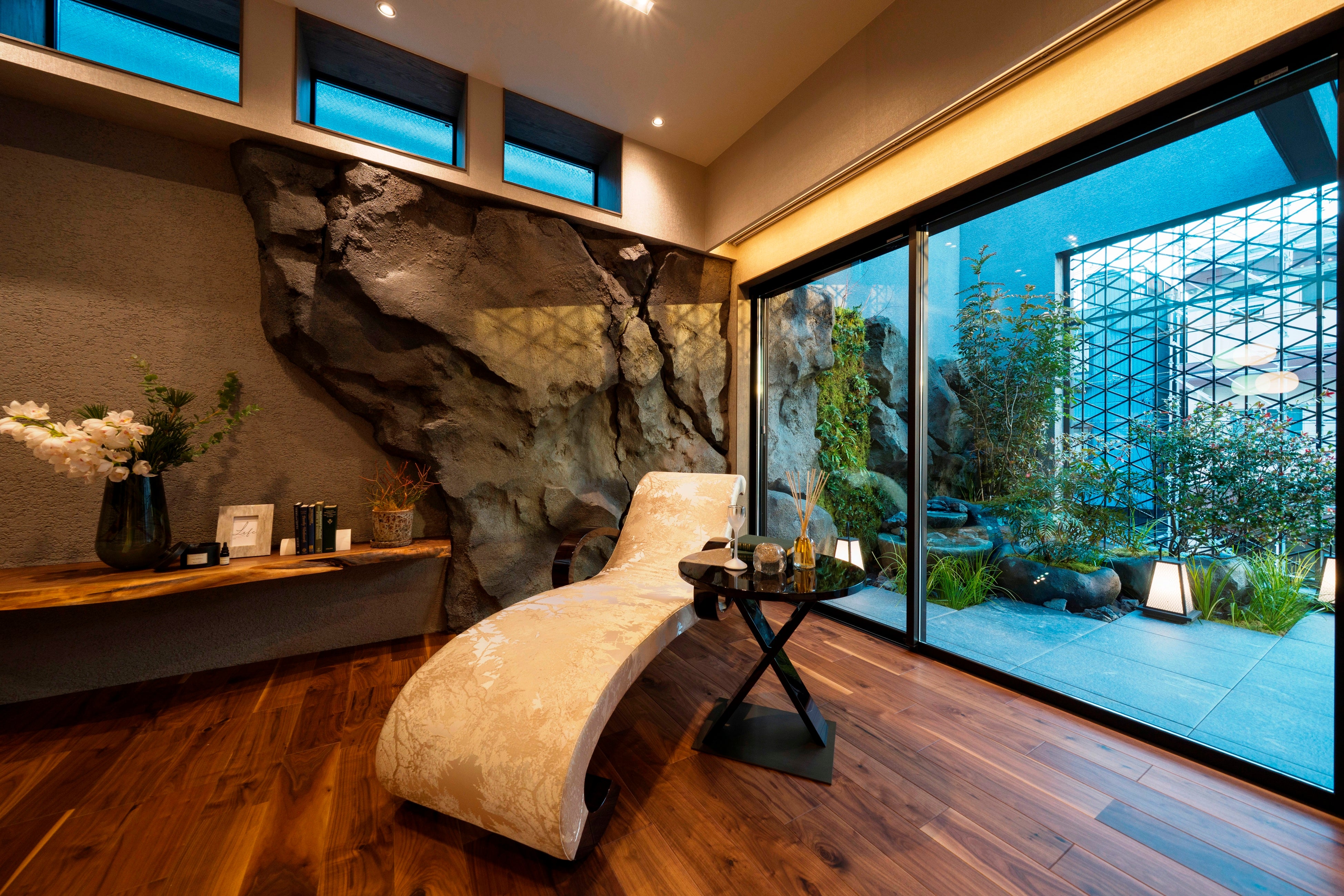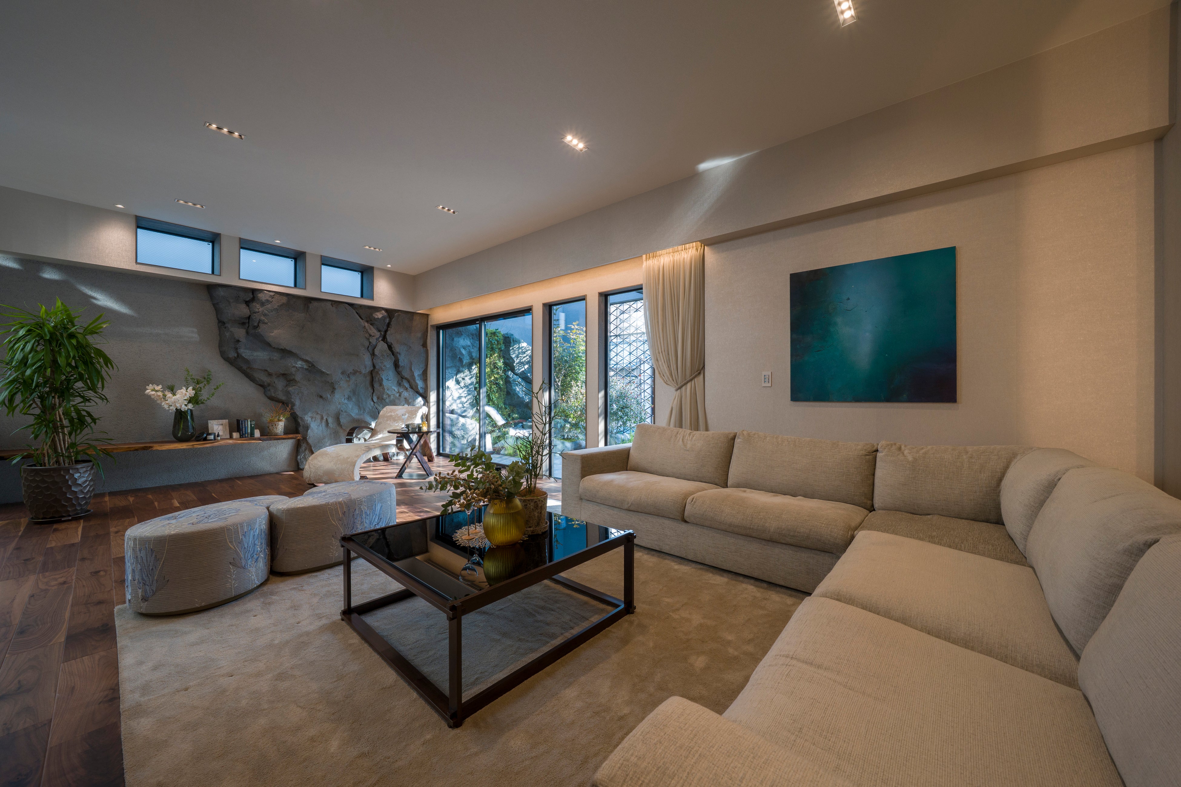 2階リビングの壁面には、石原氏が得意とする「ロックアート(岩壁)」の技法を採用。室内でありながら自然の渓谷に身を置くような量感と、長い年月を経た石の表情を再現しました。この岩壁はバルコニーの植栽と視覚的につながり、室内外の境界を越えた一体的な空間体験を生み出しています。