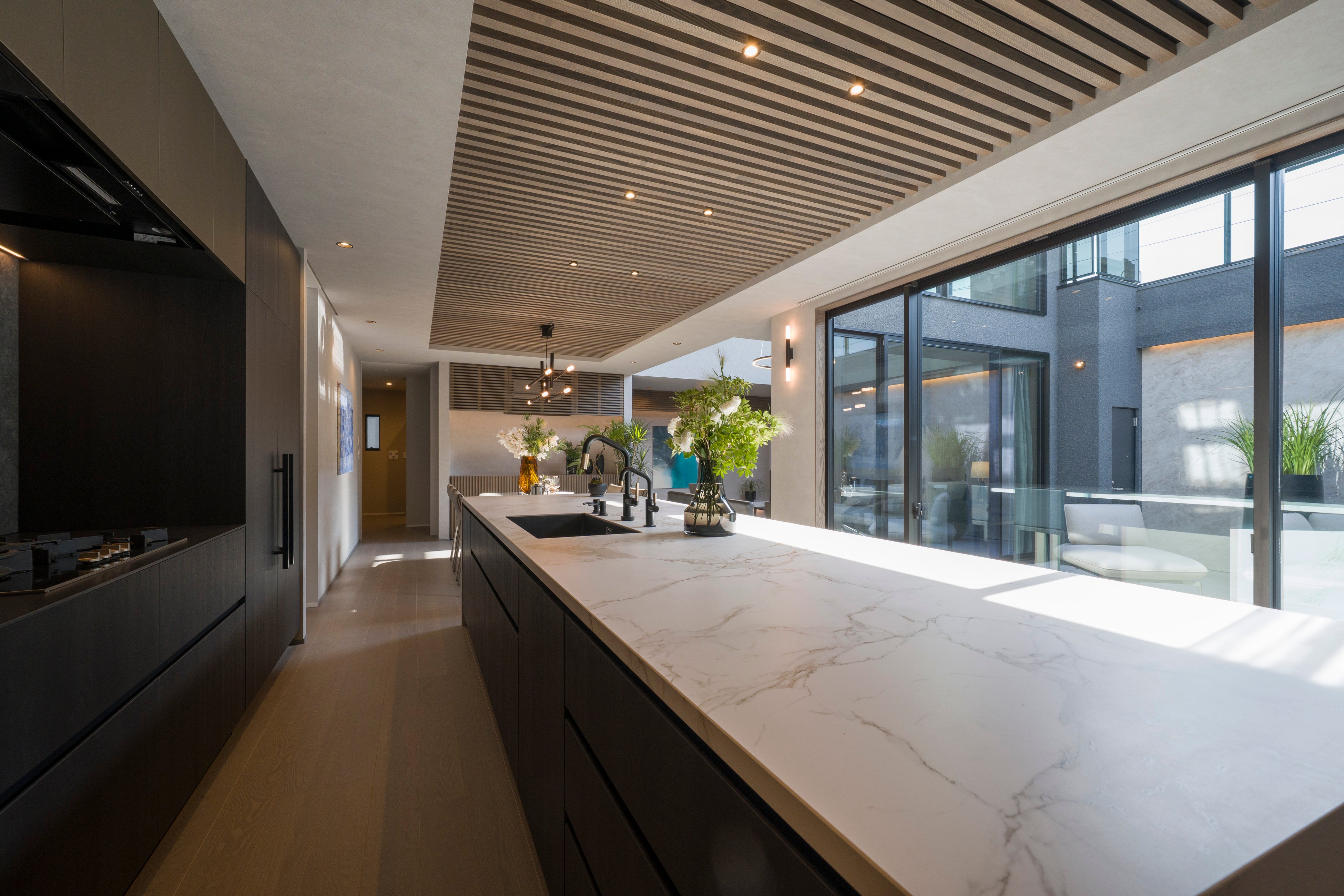 「キッチンを風景の一部とする」思想のもと、機能美と素材感を極めたオーダーキッチンを提案。