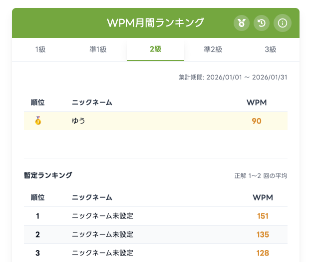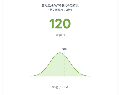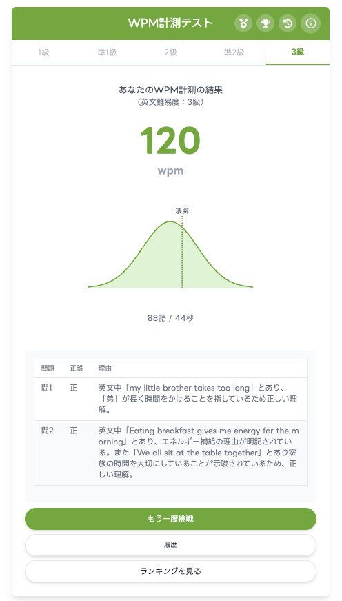 設問に正解した場合のみWPMが表示され、記録として残ります