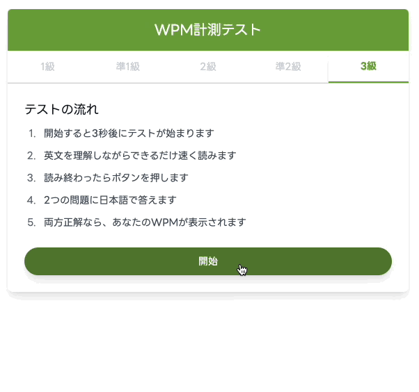 [画像6: https://prtimes.jp/api/file.php?c_id=54896&t=animationGifImage&f=0b3a4e734ca2d97adf4510cfd03c4cc8.gif ]級を選んで、開始ボタンを押すとカウントダウンが始まり、英文が表示されます。