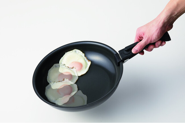 遠心力を利用して均一にコーティングするスピンコート技術により、こびりつきにくい「つるつる」の表面が実現しました。調理の際に少ない油でも食材がこびりつきにくく美しく出来上がるのはもちろん、洗う際にもこすらずするっと汚れが落ちやすくなります。