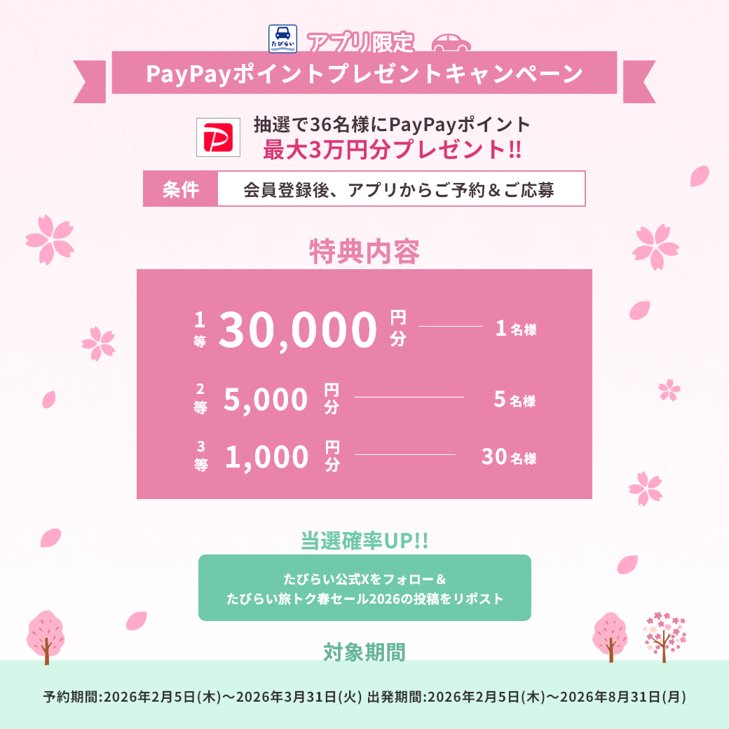 2026年2月5日(木)から3月31日(火)の期間中、「たびらいレンタカーアプリ」にてキャンペーンを実施いたします。期間中に会員登録の上、アプリからレンタカーを予約後、キャンペーンへ応募した方を対象に、抽選で36名様に最大3万円分のPayPayポイントをプレゼントいたします。