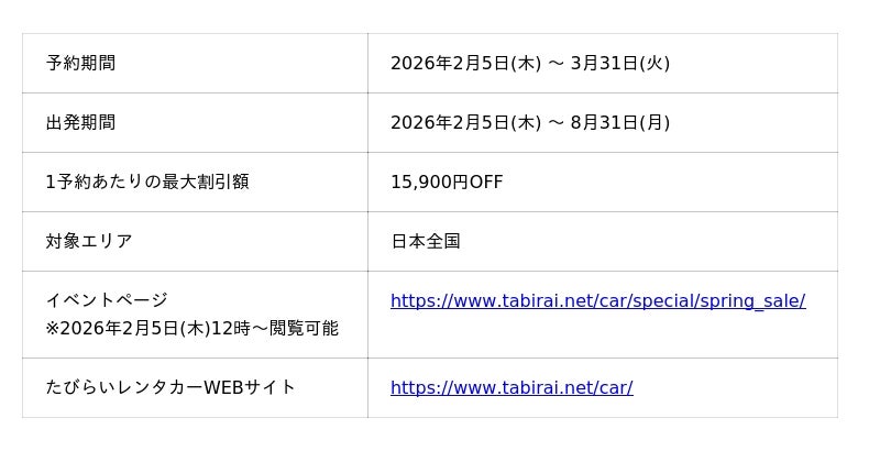 「たびらい旅トク春SALE2026」の対象プランも本キャンペーン対象商品となりますので、ご予約はたびらいレンタカーアプリからがおすすめです。