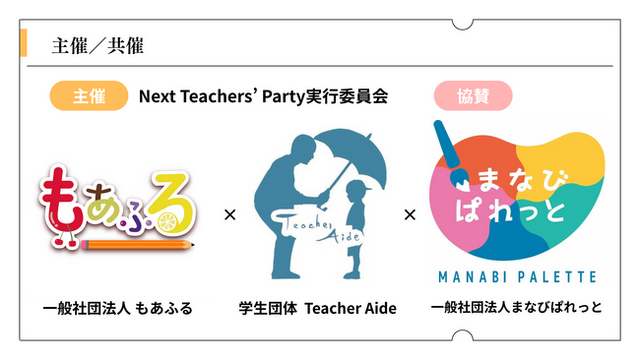 主催: Next Teachers' Party実行委員会(一般社団法人もあふる、学生団体TeacherAide)