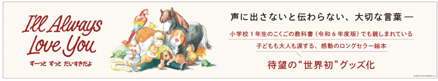 この度、その第2弾として、全書店でも愛されているロングセラー絵本「ずーっとずっとだいすきだよ(評論社)」を世界で初めてグッズ化し、2026年2月1日より順次販売開始いたします。