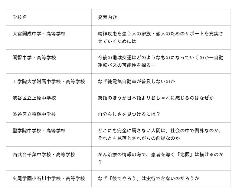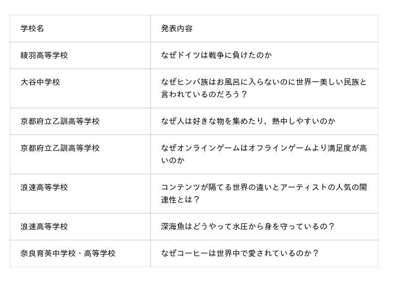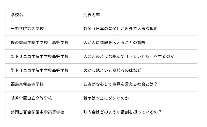 ※発表校および発表内容は、随時更新します。また、予告なく変更となる場合がございます。あらかじめご了承ください。