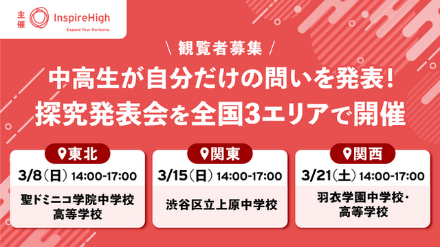 「世界とつながる探究的な学びを手軽に教室で」をコンセプトとしたEdTech教材を提供する、株式会社Inspire High(本社:東京都千代田区、代表:杉浦太一)は、全国の中高生が自身の探究の成果を共有する探究発表会を、2026年3月に東北・関東・関西の3エリアで開催いたします。
