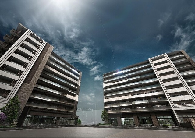 ▲外観完成予想CG※1(画像左から「レーベン鶴瀬駅前 ACCEZ」「レーベン鶴瀬駅前 SOLEIZ」)
