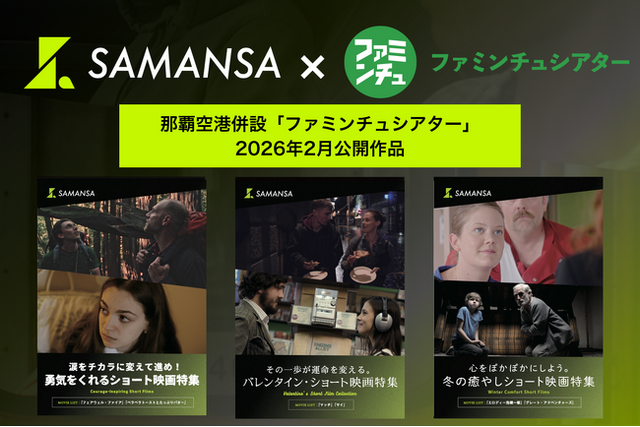 株式会社SAMANSA(本社:東京都渋谷区、代表取締役社長:岩永 祐一、共同代表:遠山 孝行)は、有限会社チャオジャパントレーディング(本社:沖縄県那覇市、代表取締役社長:洲鎌 一馬)が那覇空港で展開する「ファミンチュシアター」において2月1日より、新たな作品を公開することをお知らせいたします。今月は『その一歩が運命を変える。バレンタイン・ショート映画特集』『涙をチカラに変えて進め!勇気をくれるショート映画特集』 『心をぽかぽかにしよう。冬の癒やしショート映画特集』の3パッケージ、計6本を公開。