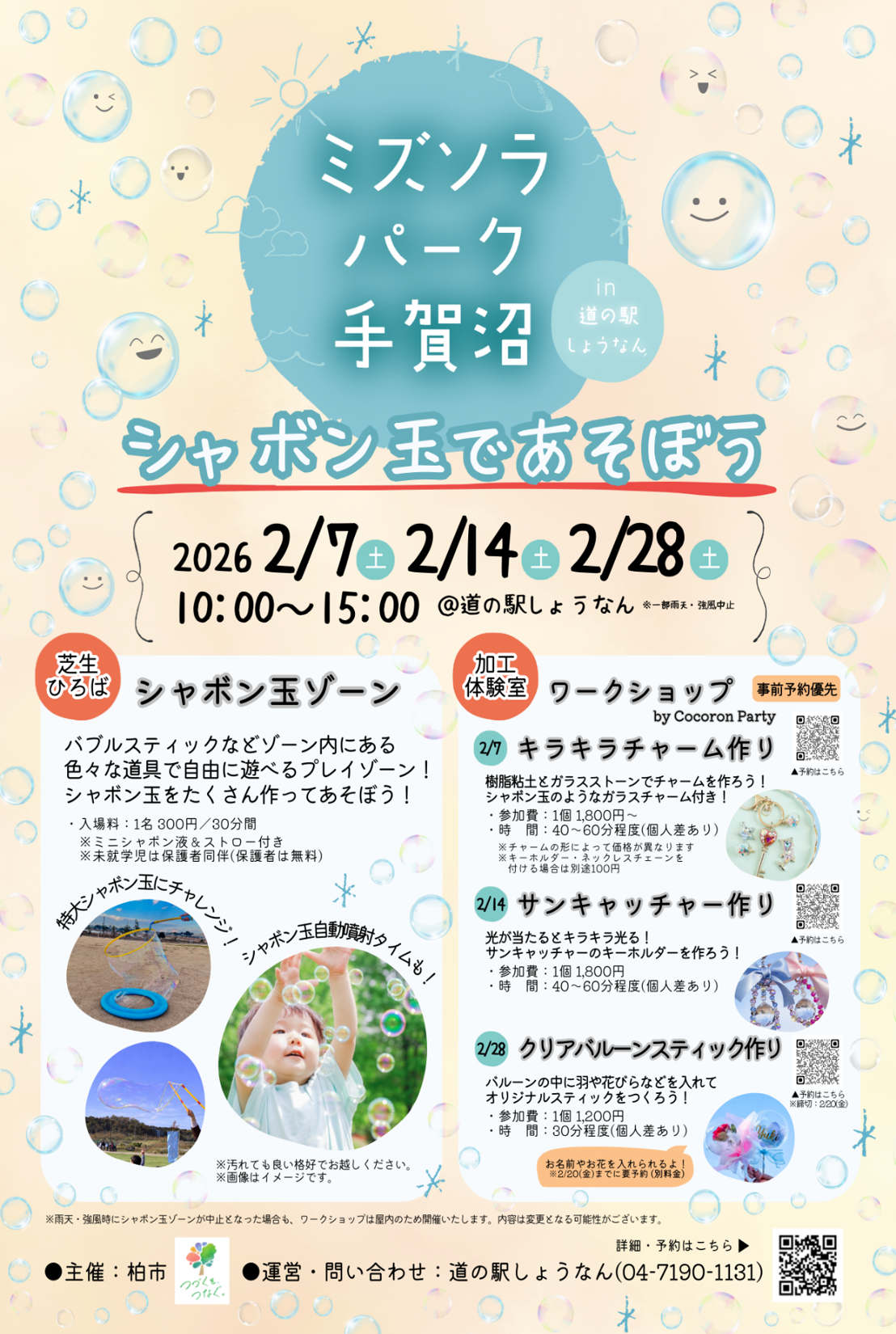 - 雨天・強風時にシャボン玉ゾーンが中止となった場合も、ワークショップは屋内のため開催いたします。